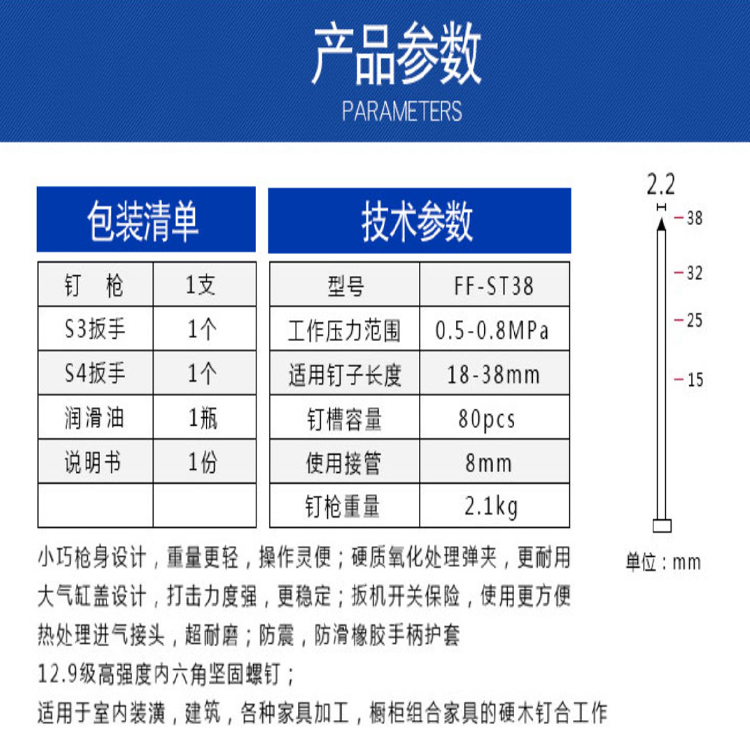 東成氣動鋼釘槍FF-ST38堅固耐用高強度機身