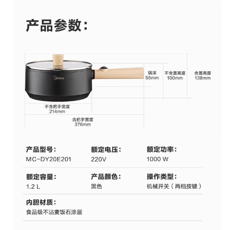 美的(Midea)多功能麥飯石1.2L迷你家用大功率不粘鍋