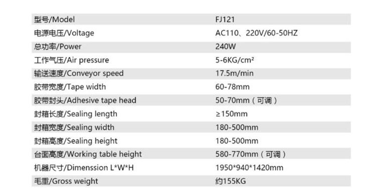 膠帶封箱機FJ121 全自動上下驅動封箱機 紙箱封箱機 全自動 產品參數圖