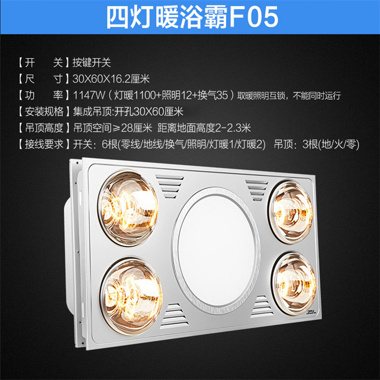 集成吊頂四燈暖浴霸 取暖換氣LED照明三合一 F05