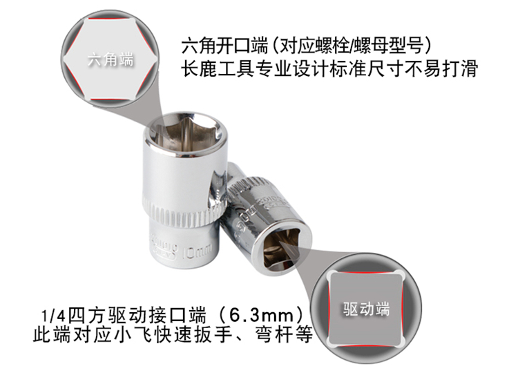 長鹿中飛10mm系列鏡面6角套筒頭子鉻鋇鋼薄壁設計、扭矩大、硬度高、韌性強。