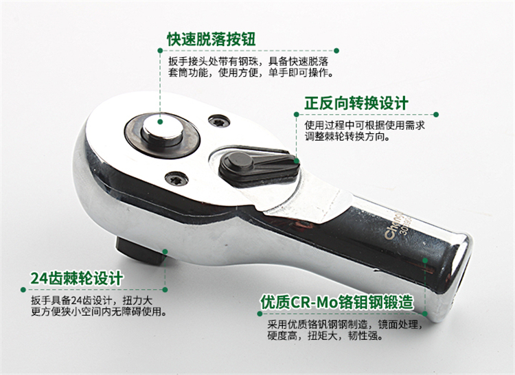 長鹿19mm系列重型棘輪頭采用優質鉻釩鋼鍛造,鏡面處理、硬度高、韌性性。