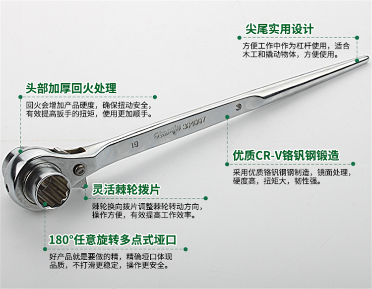 長鹿工業級尖尾棘輪扳手兩用扳手采用優質鉻釩鋼鍛造,整體熱處理,硬度高,堅固