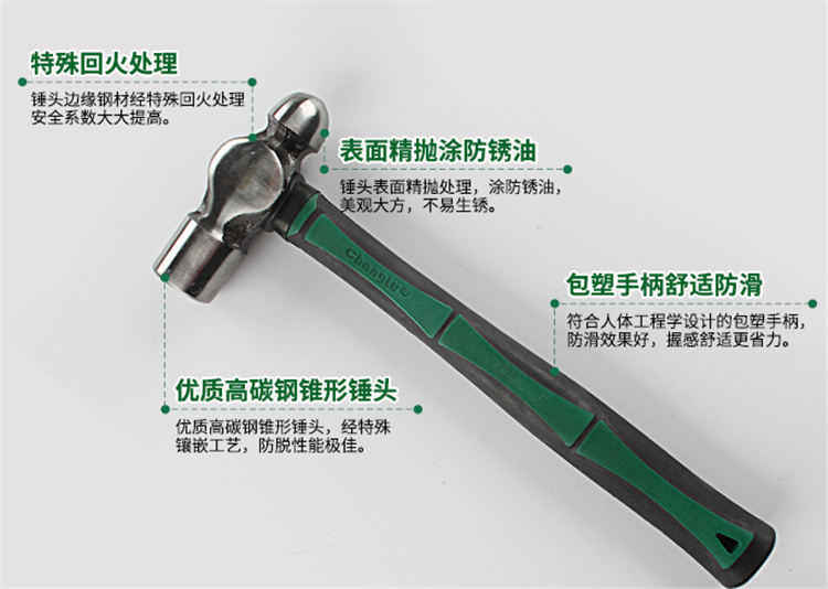 包塑纖維柄圓頭鍾優(yōu)質(zhì)高碳鋼錐形鍾頭,經(jīng)特殊鑲嵌工藝,防脫性能好。