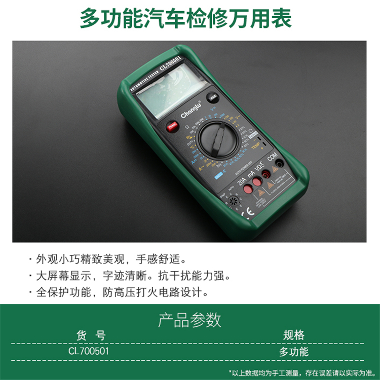 長鹿多功能汽修萬用表大屏幕顯示,字跡清楚,抗干擾能力強(qiáng)。全保護(hù)功能,防高壓