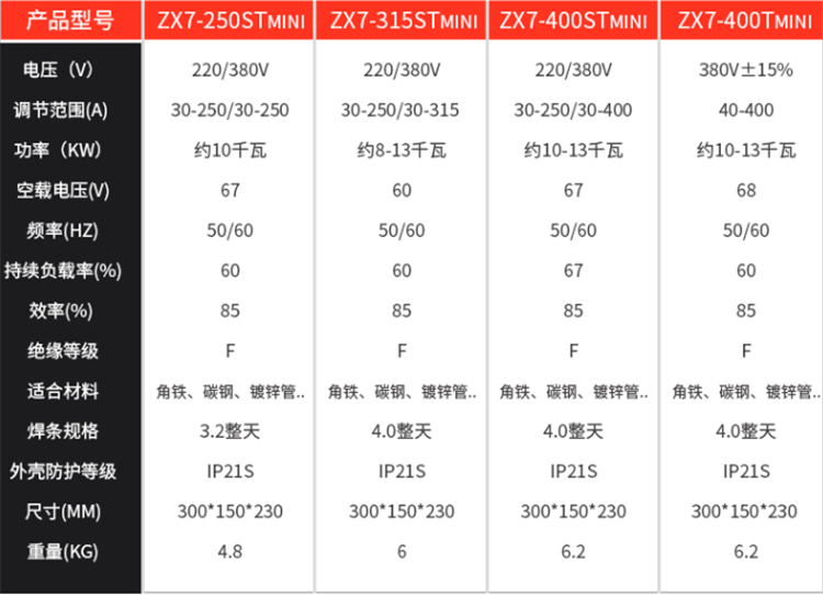 東升電焊機ZX7-250STMINI/315STMINI/400ST智能雙電壓逆變直流技術參數