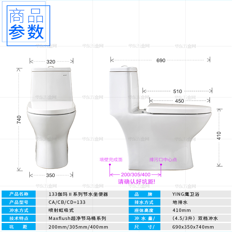 鷹牌133坐便器商品參數(shù)圖,雙檔沖水