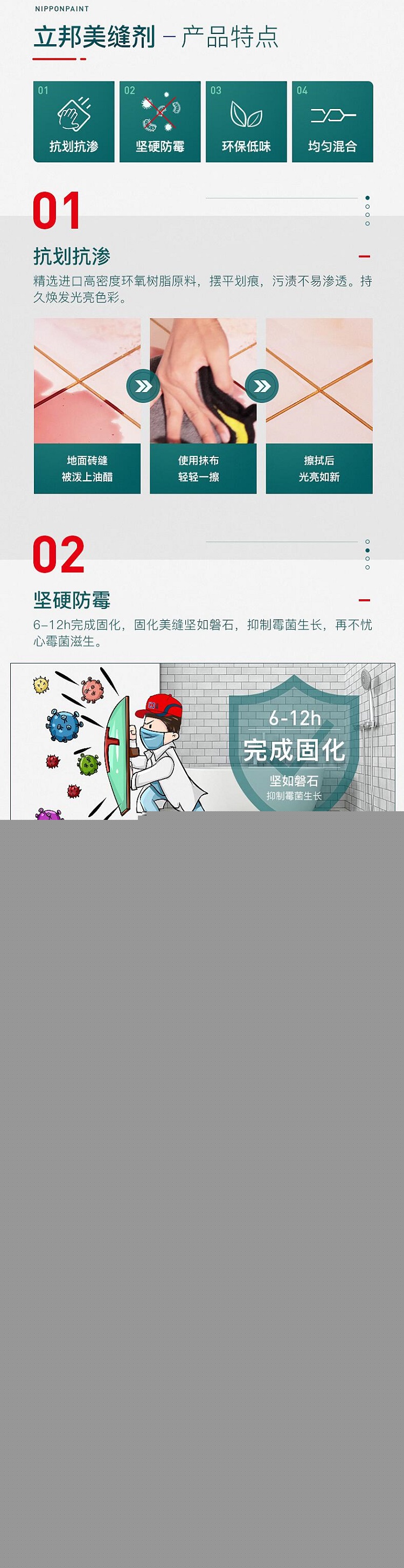 6-12h完成固化,固化美縫堅(jiān)如磐石,抑制霉菌生長(zhǎng),再不憂心霉菌滋生。