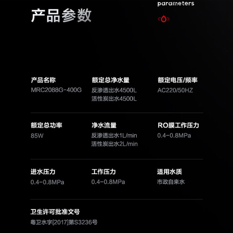 美的RO反滲透凈水機多重凈化,出水可直接飲用。- 型號名稱MRC2088G-400G