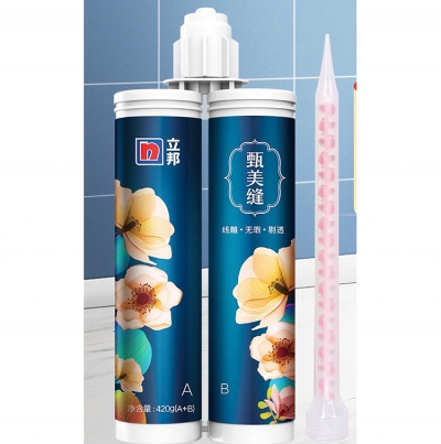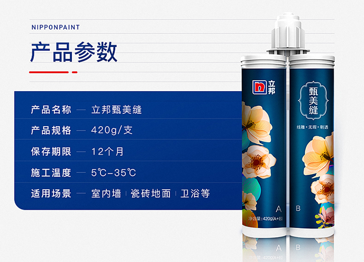 立邦美縫劑瓷磚地磚專用家用防水美縫勾縫填縫施工工具劑膠甄美縫:AB組膠組成粘度差異越小,混合愈加均勻,上磚呈現的效果才會更好!立邦雙組膠體粘度統一,施工方便,帶給您舒適的產品體驗。