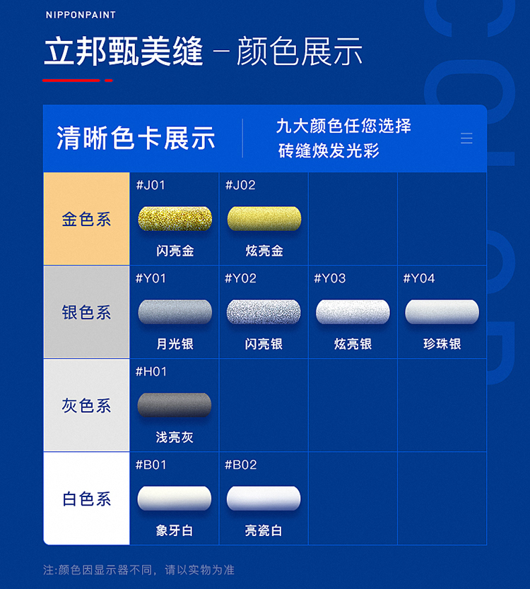 立邦美縫劑瓷磚地磚專用家用防水美縫勾縫填縫施工工具劑膠甄美縫:采用立邦凈味技術,使用高成本環保原料,施工低味,為居家健康保駕護航。