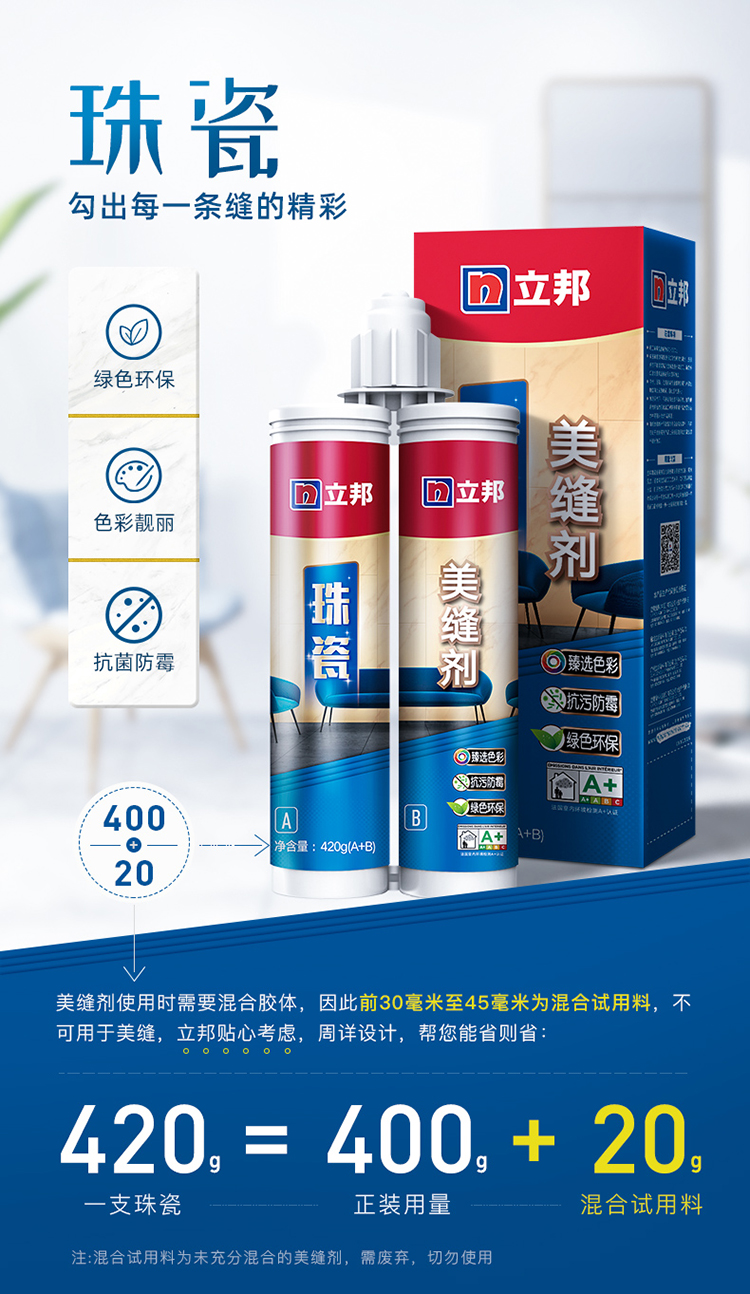 立邦珠瓷美縫劑瓷磚地磚專用填縫勾縫劑:均勻混合,AB組膠組成粘度差異越小,混合愈加均勻,上磚呈現的效果才會更好!立邦雙組膠體粘度統一,施工方便,帶給您舒適的產品體驗。