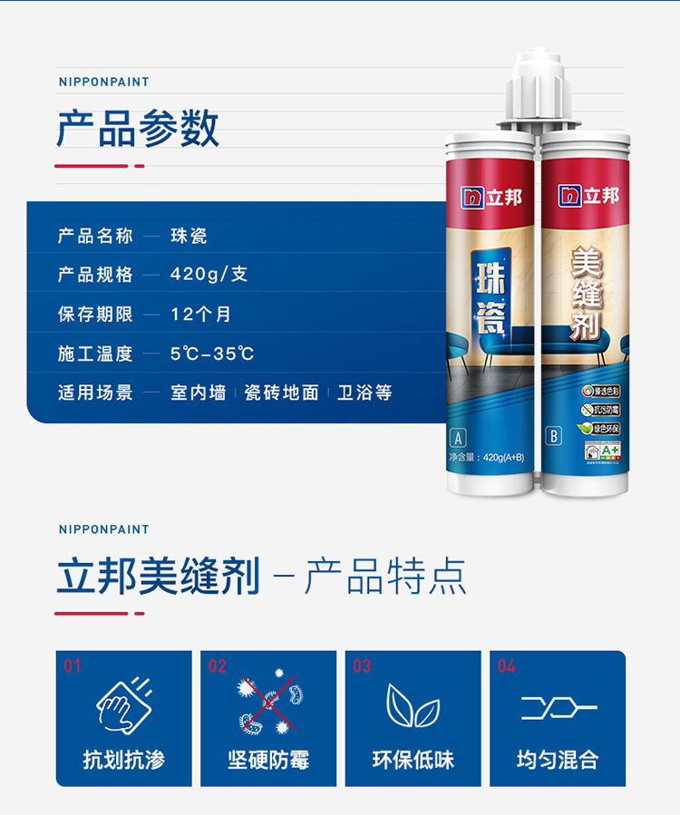 立邦珠瓷美縫劑瓷磚地磚專用填縫勾縫劑:堅硬防霉,6-12h完成固化,固化美縫堅如磐石,抑制霉菌生長,再不憂心霉菌滋生。環保低味,采用立邦凈味技術,使用高成本環保原料,施工低味,為居家健康保駕護航。