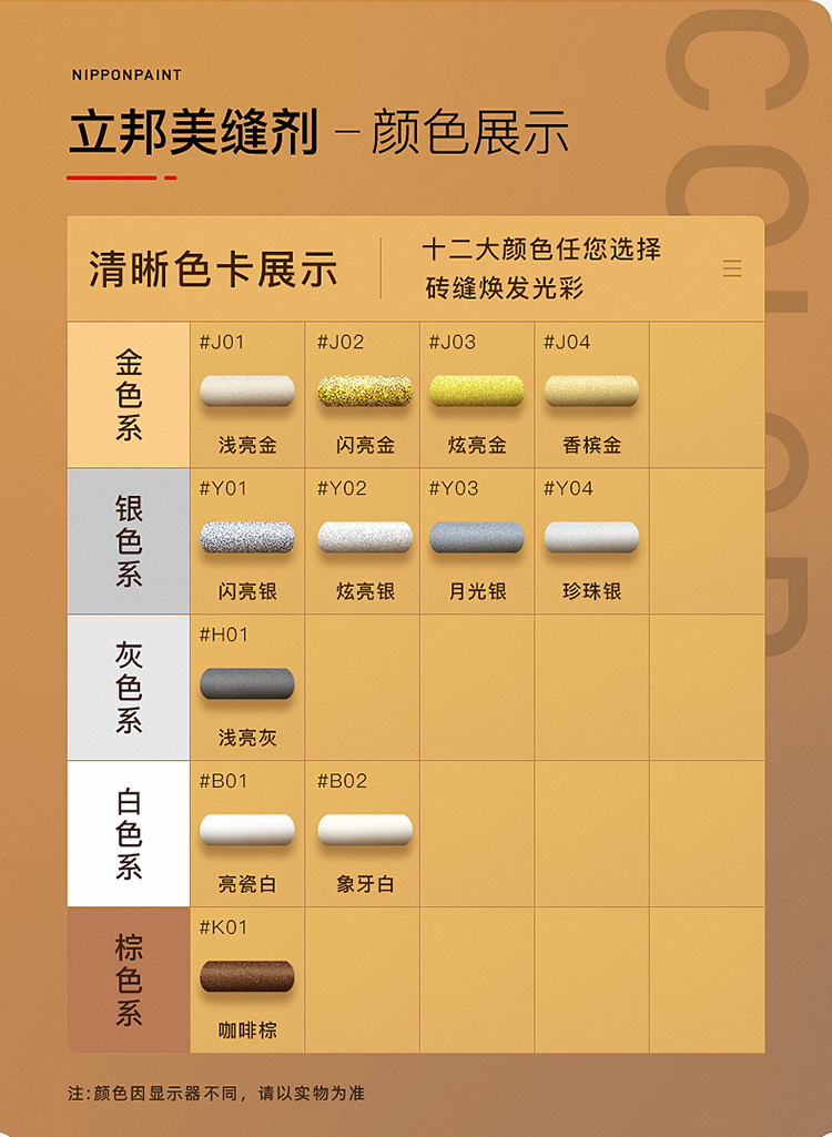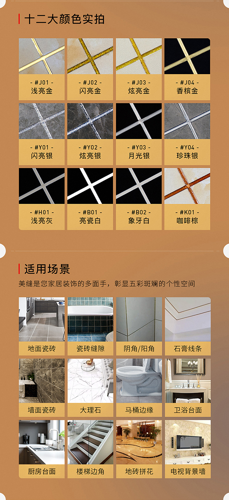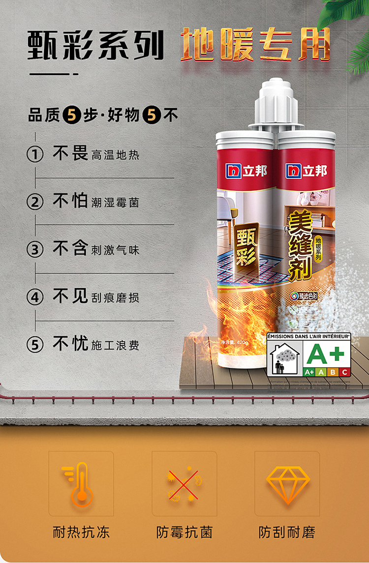立邦地暖縫美縫劑瓷磚地磚專用美瓷膠美縫膠填縫:抗劃抗?jié)B,精選進(jìn)口高密度環(huán)氧樹(shù)脂原料,擺平劃痕,污漬不易滲透。持久煥發(fā)光亮色彩。