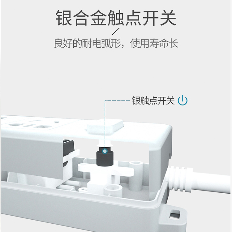 延長電源插座銀合金觸點開關,良好的耐電弧形,使用壽命長
