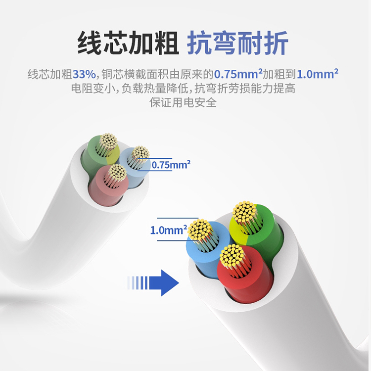延長電源插座線芯加粗,抗彎耐折