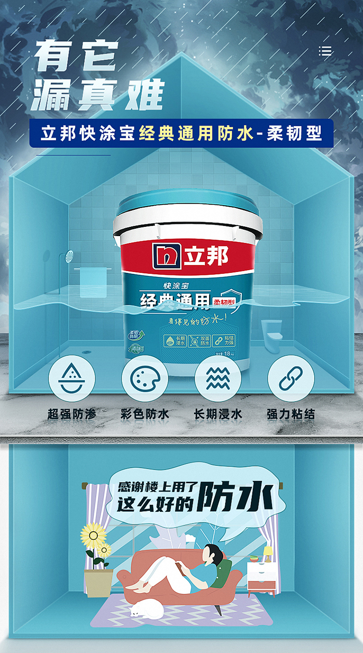 立邦防水涂料快涂寶經典通用防水材料:升級配方,抗滲壓強。