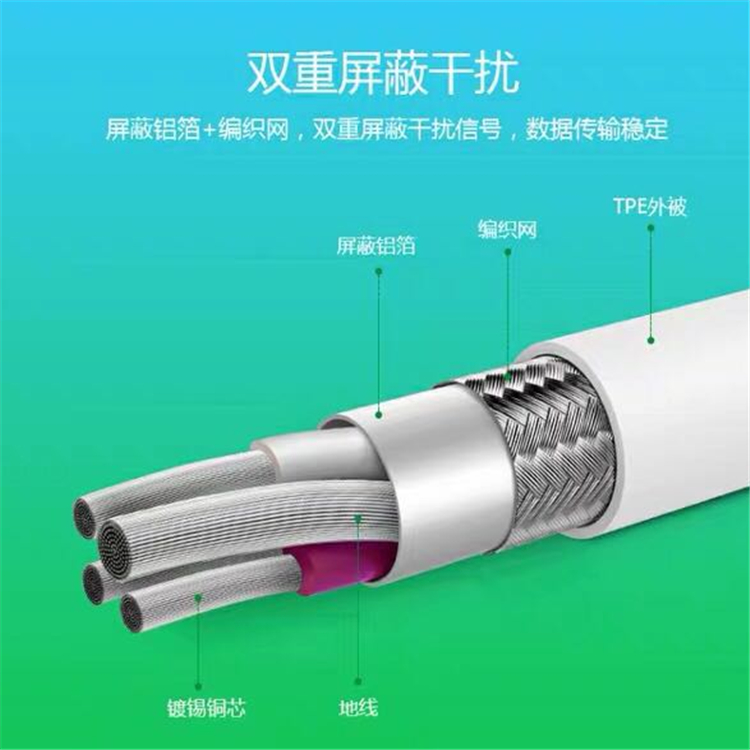 公牛抗折斷數據線屏蔽鋁箔+編織網,雙重屏蔽干擾信號,數據傳輸穩定。