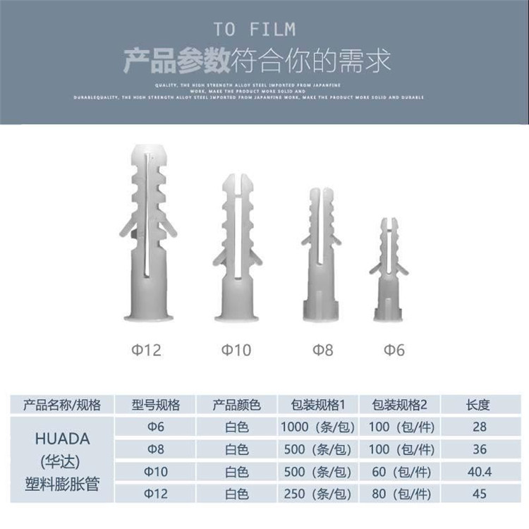 HUADA(華達(dá))塑料膨脹管:采用優(yōu)質(zhì)PE注塑而成,獨(dú)特的擰入式設(shè)計(jì),使用更加簡(jiǎn)單。