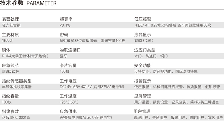 防盜鎖擁有超B級鎖芯,應急供電9V疊層電池或Micro USB(充電寶)。