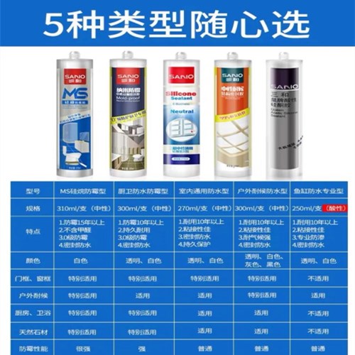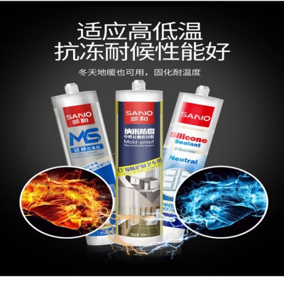 三和玻璃膠密封膠防水中性耐候硅酮膠防霉性強力免釘膠廚衛結構膠為單組分、中性固化的硅酮建筑密封膠;產品專門針對各類門窗安裝開發,對玻璃、鋁材等大部分建筑材料有良好的粘接性;具有良好的耐氣候老化性能,與其它中性硅酮膠具有良好的相容性。