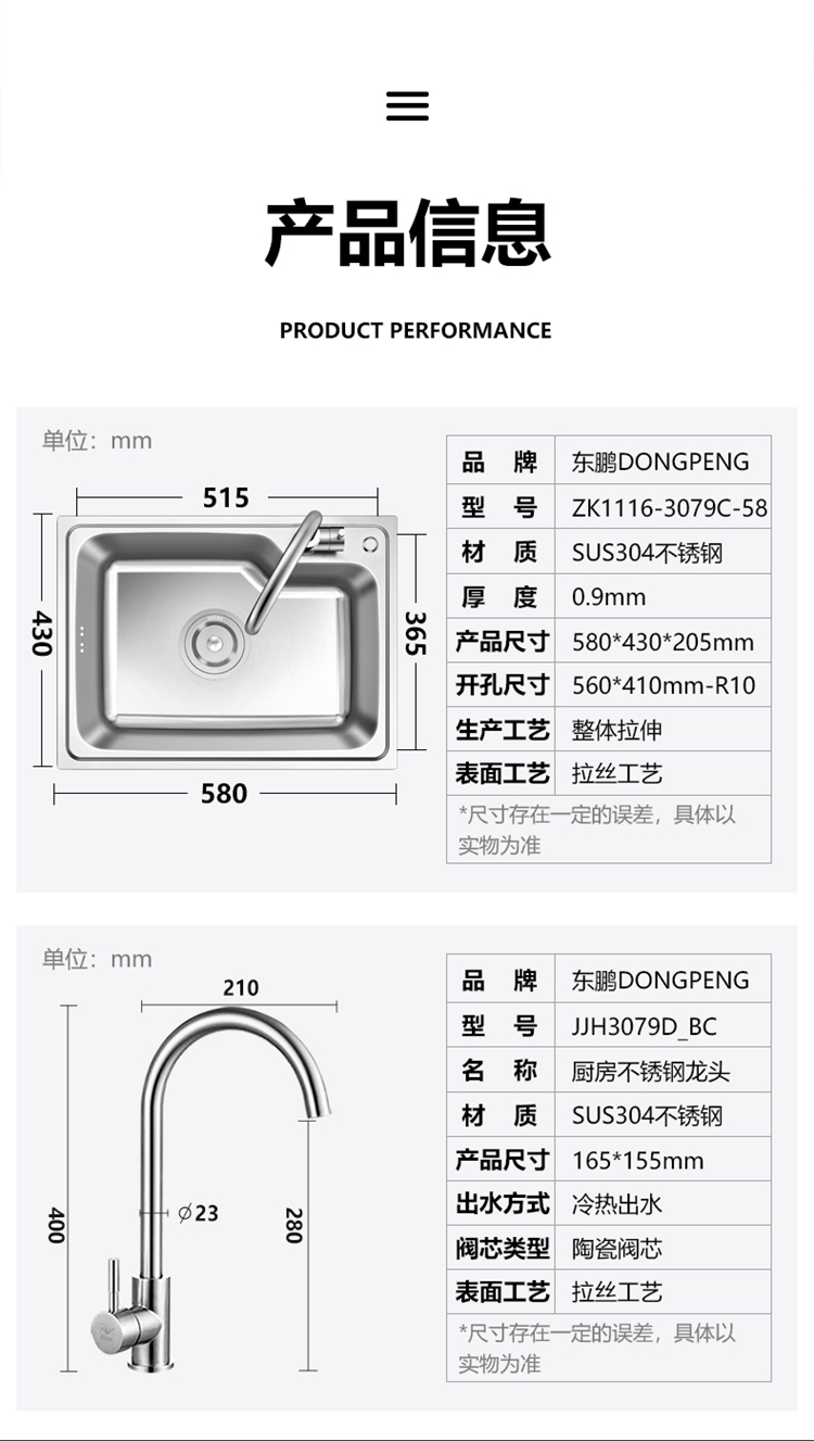 東鵬衛浴(DONGPENG)304不銹鋼水槽單槽拉絲不銹鋼洗菜盆 帶水龍頭廚房水槽