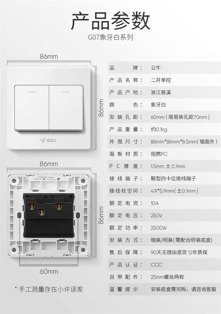 公牛開關插座面板二開單控開關86型墻壁插座墻面