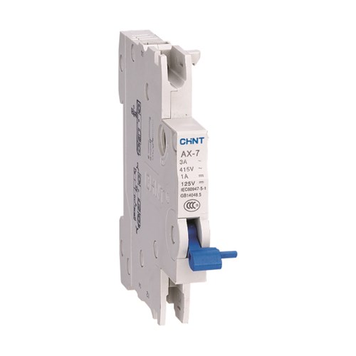 正泰AX-7輔助觸頭主要用于交流50Hz,約定發熱電流至3A,交流額定電壓至415V或直流額定電壓至125V的線路中,與NB7小型斷路器拼裝,作遠距離斷路器通斷的信號指示之用。符合標準:GB/T 14048.5、IEC 60947-5-1,獲得CCC認證。
