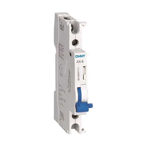 正泰AX-6輔助觸頭主要用于交流50Hz,額定發熱電流至6A,額定電壓至415V或直流額定電壓至130V的線路中,其與NB1系列斷路器拼裝,作遠距離斷路器通斷的信號指示之用。符合標準:GB/T 14048.5、IEC 60947-5-1,獲得CCC、CE認證。