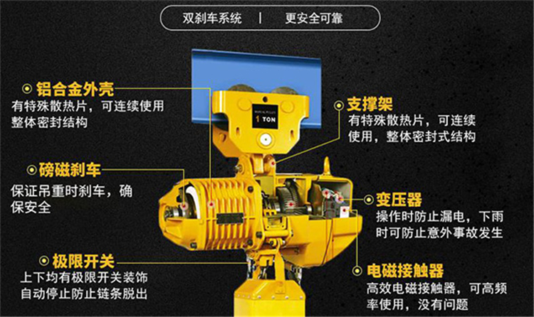 固定式環鏈電動葫蘆上下均有極限開關裝飾,自動停止防止鏈條脫出。