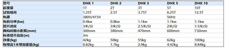 DHK型環鏈電動葫蘆參數表:起重量一般為0.1~60t,起升速度為4-20米。